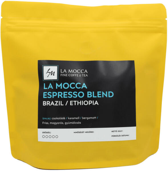La Mocca Brazil Etiopia Blend Espresso szemes kávé 100% Arabica , 100% BIO Kiegyensúlyozott, közepesen testes, csokoládé, karamell, citrus 70% Brazil Ország: Brazília, Régió: Matas De Minas, Minas Gerais Feldolgozás:száraz Pörkölés :Eszpresszó Variáns. Red Catuai 30 % Etiópia Régió: Tabe Burka, Shakisso, Hambella Feldolgozás. száraz Variáns:Heirloom Ízvilág: csokoládé ,