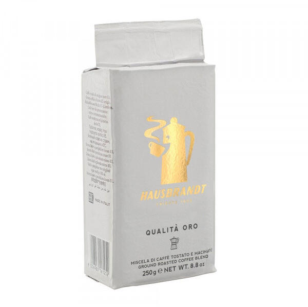 Hausbrandt Qualita Oro őrölt kávé 250g Teljes, határozott teste van, és szinte nincs savtartalma. Különleges édességével és gömbölyűségével tűnik ki, ami a brazil arabikának tudható be. Speciális őrlésének köszönhetően ideális mokkás elkészítéshez. Nettó tömeg: 250 g.