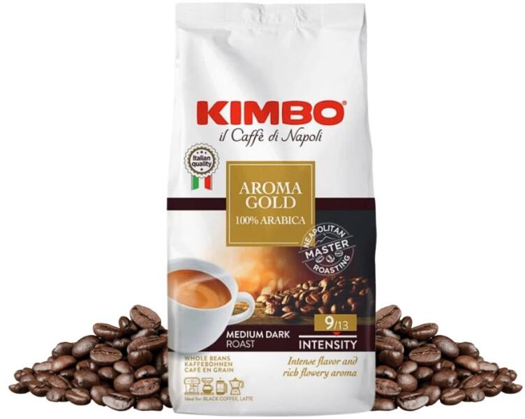 KIMBO Aroma Gold szemes kávé 250 g Arabica bab Közép- és Dél-Amerikából. Kávé gazdag virágaromával a háttérben. Alkalmas finom eszpresszóhoz és krémes cappuccinóhoz. Készült az EU-ban.