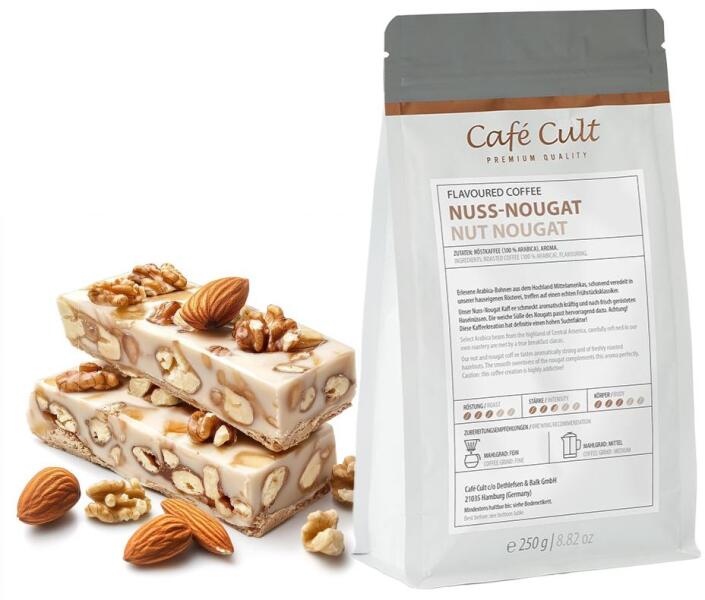 Ca fé Cult Mogyorós Nugát Ízesített, Pörkölt Szemes Kávé – A Finom Ízélmények Mestere A Café Cult Mogyorós Nugát ízesített, pörkölt szemes kávé minden csésze egy különleges ízutazás, ahol a válogatott Arabica kávé találkozik a gazdag mogyorós nugát selymes ízével. Ez a kiváló minőségű kávé egyesíti a pörkölt mogyoró és az édes nugát harmóniáját