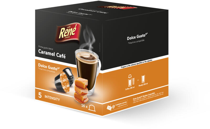 A Café René Grande Caramel (Caramel Café) Dolce Gusto® kompatibilis kávékapszula olyan Arabica fajták keveréke - melyek hazája Brazília és India kiváló termőterületei - melyet hintésnyi Robusta-val és a karamell zamatával gazdagítottak. A kávészemeket a pörkölést követően különleges karamell esszenciával itatják át, ezért a frissen főzött kávét a karamell finom,