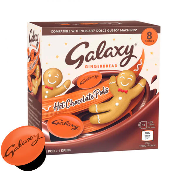 Fedezze fel a Galaxy Gingerbread kávékapszulákat, amelyek egyedülálló mézeskalács ízű forró csokoládét kínálnak, gazdagított a kiváló minőségű Galaxy csokoládéval. A csomag 8 kapszulát tartalmaz, amelyek tökéletesen illeszkednek a Dolce Gusto gépébe, így bőséges méretű, ízletes italokat készíthet. Mindegyik kapszula gazdag, krémes ízvilágot kínál, ahol a ha