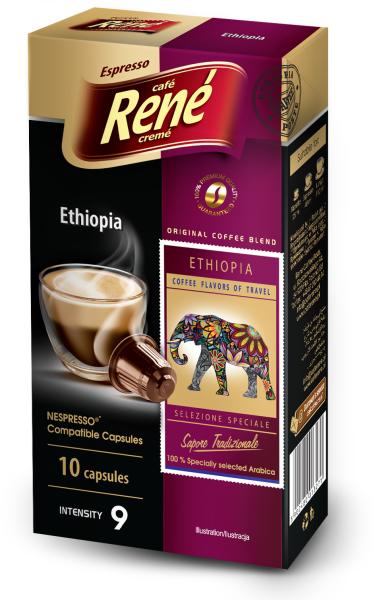 A Café René Ethiopia NESPRESSO ® kompatibilis kávékapszula 100 % tisztaságú, sötét pörkölésű, eredeti Arabica Etiópiából. Az Ethiopia a legfinomabb etióp arabica kávészemek kompozíciója. Magasabb savtartalom és dióra emlékeztető buké jellemzi. Középsötét pörkölésű, finomra őrölt kávé, 100% Arabica, kapszulában (10db). Intenzitás: 9 Ez a termék partnerünk,