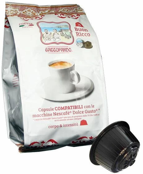 A Gattopardo Gusto Ricco DOLCE GUSTO kompatibilis kapszulák ideális választás a gazdag és aromás kávé kedvelőinek. A csomag 16 kapszulát tartalmaz, amelyek garantálják a prémium minőségű kávé élményét otthon vagy bárhol, ahol szeretné élvezni a finom italt. A Gusto Ricco gazdag ízvilággal rendelkezik, amely az intenzív pörkölésnek és a gondosan válogatott kávészem