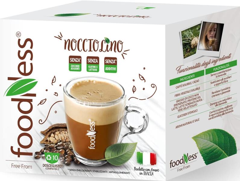 Foodness Mogyorós kávékapszula Dolce Gusto-hoz 10 db Mogyorós kávé ízű ital, édesítőszerrel, hozzáadott cukor nélkül, glutén nélkül. Hozzávalók: maltit, eritrol; Oldható növényi rost**. Instant kávé (10%), sovány tejpor . Nem hidrogénezett kókuszzsír, kakaó 22/24 (2%). Aroma, tejfehérjék , só. Édesítőszer: szteviol-glükozidok. ** glükóz forrás. Az allergének