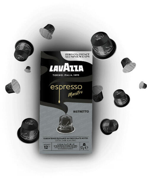 Mindegyik dobozban 10 darab kapszula ESPRESSO MAESTRO RISTRETTO : Egy Lavazza kávékeverék, ideális ristretto-hoz, kiegyensúlyozott, aromás, nagy egyéniséggel. 10 alumínium kapszula, Nespresso gépekkel kompatibilis. AROMÁS JEGYEK : Ezek a kávékapszulák ideálisak egy erős és intenzív espresso vagy ristretto készítéséhez, gazdag aromával, csokoládé és karamell jegyekkel. ÖS