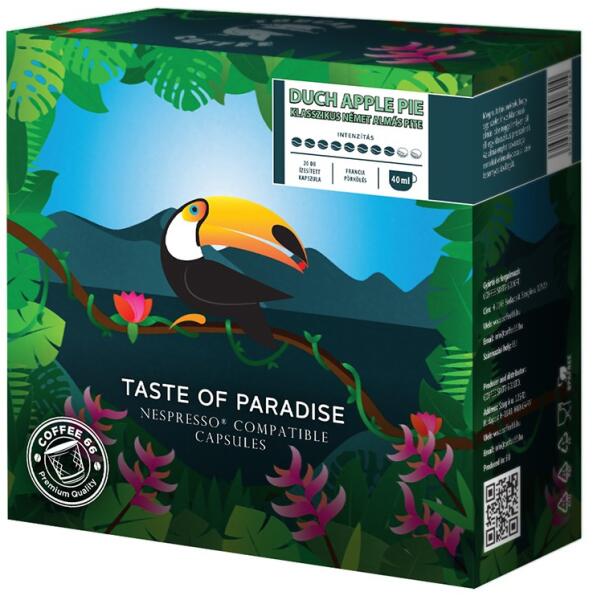 TOUCAN Nespresso kompatibilis kávékapszula ALMÁS SÜTI IZ Megmutatjuk nektek, hogy reggel egy szelet almáspite milyen jól áll egy klasszikus pressónak. Az alma savassága rendkivül jól ellensulyozza a kávé kesernyés izvilágát. Tettünk hozzá némi vajat, hogy krémes legyen, és természetesen vaniliát, hogy édesebb, illatosabb legyen. Ajánljuk forró tejes kávénak fogyasztva.