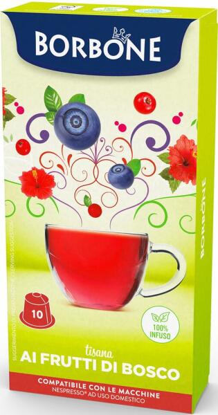 Caffe Borbone gyógytea erdei gyümölcsökkel Nespresso® kapszula 10 db Finom ízcsokor hibiszkuszvirággal, csipkebogyóval, narancs- és citromhéjjal, bodzával és áfonyával. Mindezt élvezheti kedvenc teájában Az ízek robbanása, amely azonnali izgalomba hoz. Javasolt adagolás: 140ml / 3g. Allergén anyagok: nem ismert Energiaérték 140 ml-re: Energia 10 kJ/2 kcal. Zsírok 0 g ebből