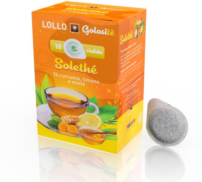 Oldható ital Tea Solethè Kurkuma Citrom és méz ESE hüvely Lollo Caffe 18 db A kurkuma és a friss citrom ízét a méz finom íze édesíti. Hozzávalók: Zöld tea levelek. 10% kurkuma rizóma. Természetes citrom és méz aroma 6%. Méz granulátumban 0,5%. Citromhéj 0,5%.