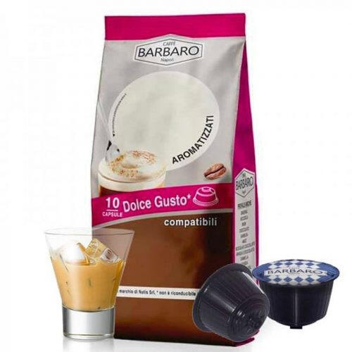 Caffé Barbaro ír krémes kávé Dolce Gusto 10 kávékapszula, prémium minőségű ír krémes (Baileys) ízesítésű krémes nápolyi tejes kávé különlegesség kedvező áron alkohol nélkül. A termék egy kevés tejport és cukrot is tartalmaz. Készítsen Dolce Gusto kapszulás kávéfőzőjével kávéházi minőségű olasz kávékat és kóstoljon bele a valódi kávékülönlegess