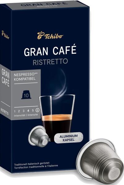 Tchibo Gran Cafe Ristretto Nespresso kapszulához 10 db Erős ristretto stílus, finom keserű aromával Jellegzetes kávé könnyű, fás jegyekkel. A válogatott dél-amerikai Arabica kávék és az indiai robusta intenzív keveréke. Hagyományos olasz stílusban sült. Az EU-ban készült.