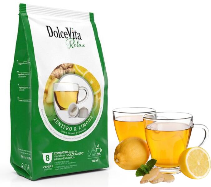 Dollce kapszula Gusto gyógytea GYÖMBÉR citrommal Italfoods 8 db Instant tea. Gömbéres ital citrommal. Laktóz- és szacharózmentes. Gluténmentes termék Vegán termék. Összetevők: Gyömbér, zsálya, citromfű. Készült az EU-ban.