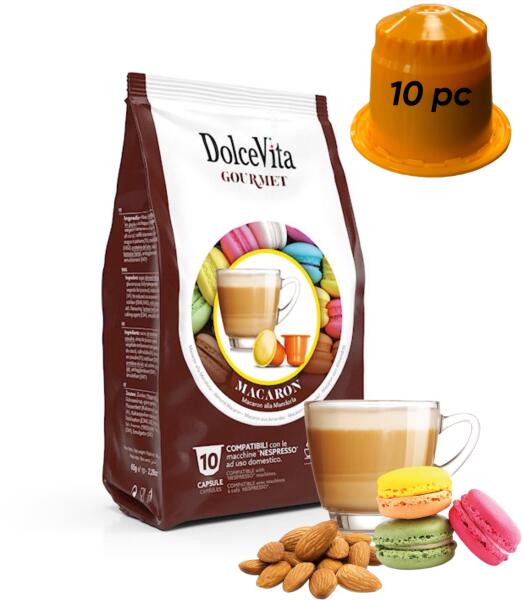 Dolce Vita Mandula Macaron Nespresso® 10 kapszuláhozInstant kávéital mandula ízzel. Híres francia desszertek ízű, mandula ízű ital. Hozzávalók:Cukor, szárított fölözött TEJ , szárított tejsavó. Növényi zsírok (kókuszdió), laktóz ( TEJ ), oldódó kávé (4%). Zsírszegény kakaópor (3%), aroma, só. Karamellizált cukor, TEJTERMÉK fehérjék . Stabilizátor (E340), csom