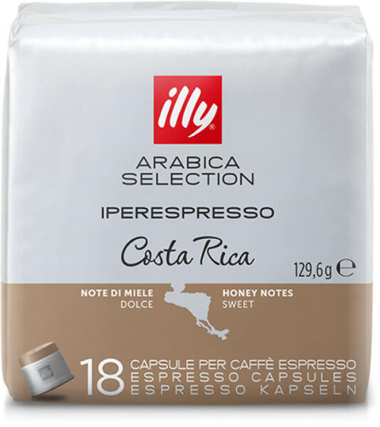 Területszelektált (Single Origin) 100% Arabica kávé. illy Costa Rica Arabica Selection kávét a méz, a karamell és a vanília édes jegyei jellemzik, citrusfélék, csokoládé és szárított gyümölcsök jegyei. Egy kapszulában 6,7 gramm optimálisan darált és tömörített kávé van, kb 30%-kal több mint más gyártók kapszuláiban! Egy csomag 18 db kapszulát tartalmaz.
