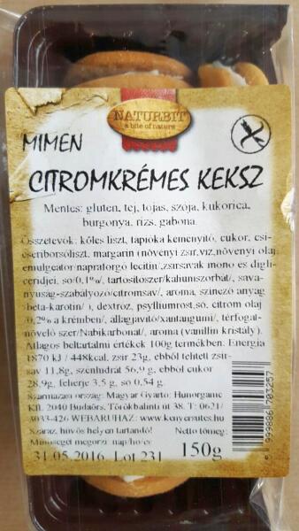Citromkrémes töltött keksz. 150 g-os töltött keksz; Naturbit termék a "minden-mentes"élelmiszerek kedvelőinek.