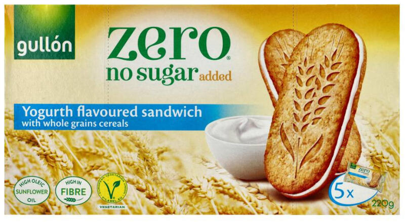 Joghurtízű krémmel töltött keksz teljes kiőrlésű gabonákból, hozzáadott cukor nélkül, édesítőszerrel. Rostforrás.