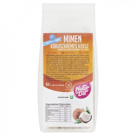 Its us mimen minden mentes keksz kókuszkrémes 150 g Összetevők: köles liszt, tápióka keményítő, csicseriborsó liszt, dextróz, kakaópor, psyllium rost, térfogatnövelő szer (nátrium-bikarbonát), stabilizátor (xantán gumi), margarin növényi zsír, víz, növényi olaj, emulgálószer: E471, étkezési só (0,1%), aromák, savanyúság-szabályozó anyag (citromsav), aroma, szín