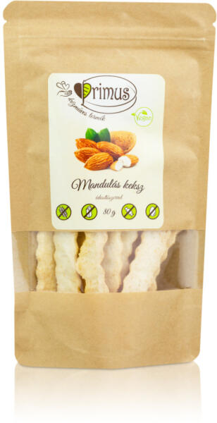 Primus vegán mandulás keksz 80 g KÉZMŰVES Vegán Mandulás keksz édesítőszerrel Csökkentett szénhidráttartalmú Összetevők : tápióka keményitő, mandula, eritrit, kókuszolaj, kókuszőrlemény, kókuszkrém, szeletelt mandula (6 %), só, stevia.