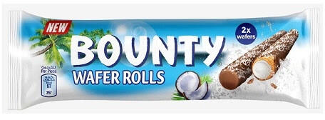 Bounty Wafer Rolls kókuszos ostya tekercs. töltőtömeg: 22,5 Összetevők: cukor, nem hidrogénezett növényi zsír (pálmamag), sovány tejpor, búzaliszt, laktóz, kakaóvaj, kakaómassza, szárított kókuszdió, tejzsír, emulgeálószerek (szójalecitin, E476), nem hidrogénezett növényi zsír (pálma), módosított keményítő, természetazonos aromák (kókuszdió), kakaópor, só.