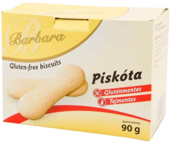 Barbara gluténmentes babapiskóta 90 g A Barbara termékcsalád kifejezetten lisztérzékenyeknek lett kifejlesztve. Igy nem tartalmaznak glutént, cukrot és tejet azonban tartalmaznak többnyire. A gluténmentes babapiskóta ideális fantáziadús desszert alkotásokhoz, mint például tiramisu, sütemények vagy kávé mellé. Valóban a legvadabb desszert álmokat váltja valóra. Próbáld k