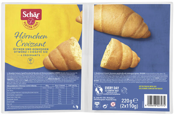Schär gluténmentes croissant 220 g Puha, édes croissant glutén- és laktózmentesen. Ha egy tipikus reggeli péksüteményre vágyunk, tökéletes választás lehet! A csomag 3 finomságot rejt, csak rajtunk áll, mivel fogyasztjuk: lekvár, méz, mogyorókrém... vagy esetleg megpróbálkozunk a bátrabb édes-sós párosítások egyikével. Összetevők: kukoricakeményítő , víz , kovász