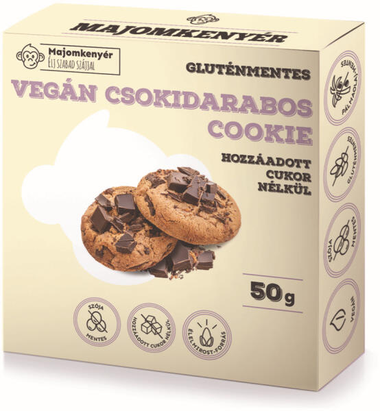 Majomkenyér csokidarabos vegán keksz hozzáadott cukor nélkül 50 g A Majomkenyér Vegán Csokidarabos cookie hozzáadott cukor nélkül készül. Gluténmentes, vegán, tojásmentes, tejmentes, élelmirost-forrás, szójamentes, pálmaolajmentes. Egészséges, vegán nassolnivaló csokidarabokkal.