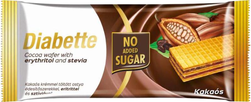 Kakaós krémmel töltött ostya, hozzáadott cukor nélkül, édesítőszerekkel, gluténmentes.