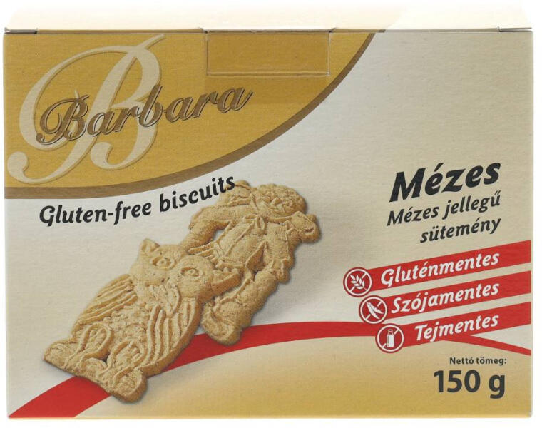 Barbara gluténmentes mézes jellegű teasütemény 150 g Összetevők : kukoricakeményítő, margarin (növényi olajok és zsírok (pálma, repce, szója, napraforgó) víz, só, emulgeálószerek: zsírsavak mono és digliceridjei, tartósítószer: kálium-szorbát, savanyúságot szabályozó: citromsav, színezék: karotinok, aroma), cukor, tojás, rizsliszt, méz (5, 6%), kukoricaliszt, bu