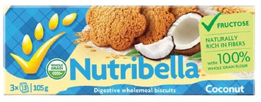 Kókusszal ízesített, teljeskiőrlésű lisztből készült, vegánok által is fogyasztható, élelmi rostokkal dúsított, élesztő, tartósítószer, telítetlen zsírsav és adalékanyag mentes keksz. 105 g-os keksz fruktózzal; Nutribella termék az egészséges élelmiszerek kedvelőinek.