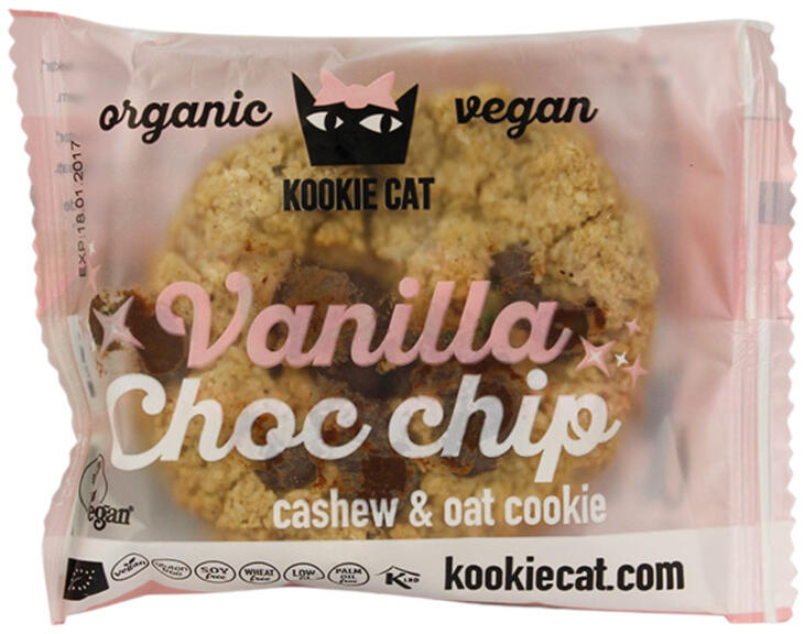 Kookie Cat bio vegán kesudiós zabkeksz vanília-csoki 50 g Összetétel: gluténmentes zabpehely*, kesudió*, kókuszvirág nektár*, kókuszreszelék*, csokoládé darabok*(8%)(kakaómassza*, kókuszvirág cukor*, kakakóvaj*), kókuszolaj*, kókuszchips*, bourbon vanília* (0,1%), só. *alapanyagok ellenőrzött ökológiai gazdálkodásból. Gluténmentes, tejmentes, szójamentes, tojásmente