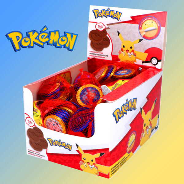 Pokémon Chocolate Coins csoki érmék. töltőtömeg: 45g Összetevők: cukor, teljes tejpor, kakaómassza, kakaóvaj, emulgeálószer (napraforgó lecitin), természetes vanília aroma. Átlagos tápérték 100g-ban Energia 521kcal Zsír 28g melyekből telített zsírsavak 17g Szénhidrát 60g melyekből cukrok 59g Fehérje 6,1g Só 0,12g