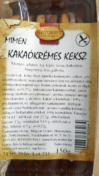 Kakaókrémes töltött keksz. 150 g-os töltött keksz; Naturbit termék a "minden-mentes"élelmiszerek kedvelőinek.