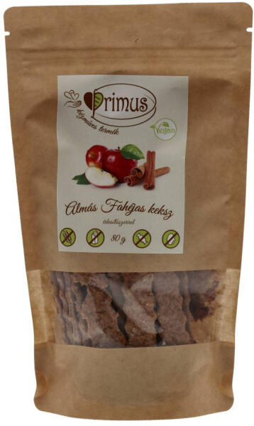 Primus vegán almás-fahéjas keksz 80 g KÉZMŰVES Vegán Almás Fahéjas keksz édesítőszerrel Csökkentett szénhidráttartalmú Összetevők : tápióka keményitő, mandula, eritrit, kókuszolaj, kókuszőrlemény, kókuszkrém, aszalt alma, fahéj, só, stevia.