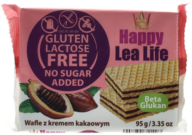 Kakaóízű krémmel töltött ostya hozzáadott cukor, valamint laktóz és glutén nélkül. Édesítőszert tartalmaz.