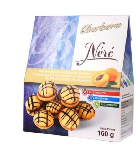 Barbara nero kajszibarackízzel töltött omlós sütemény 150 g Összetevők : lisztkeverékek [kukoricakeményítő, rizsliszt, kukoricaliszt, burgonyakeményítő, burgonyapehely, stabilizátorok: xantán-gumi, guarmagliszt, emulgeálószer: zsírsavak mono- és digliceridjei, cukorrépa rost], margarin [növényi zsírok (pálma), növényi olaj (repce), víz, emulgálószer: zsírsavak mono-