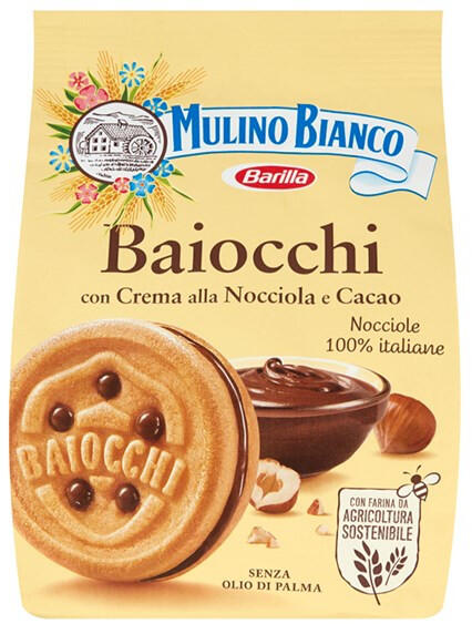 Keksz MULINO BIANCO baiocchi mogyorókrémes 260g A Mulino Bianco Baiocchi keksz egy finom olasz sütemény, amely két ropogós omlós kekszből áll, középen pedig gazdag mogyorós-kakaós krémmel van megtöltve. Ez a krém lágy, édes ízvilágával tökéletes párosítást nyújt a keksz ropogós textúrájával, így ideális snack lehet a nap bármely szakaszában. Fő jellemzők: Gazda