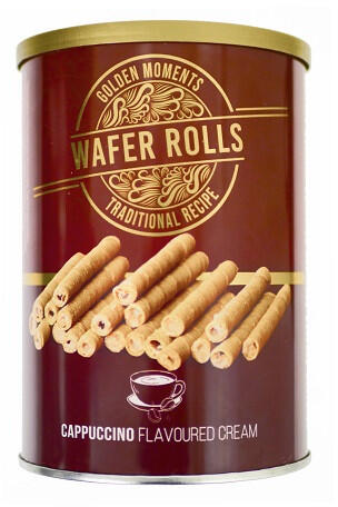 Golden Moment ostyatekercsek cappuccino ízű töltelékkel töltőtömeg: 400g Összetevők: cukor, búzaliszt, részben hidrogénezett pálmaolaj, kukoricakeményítő, savópor (tej), sovány tejpor, dextróz, fruktóz, emulgeálószer (szójalecitin), glükózszirup, koncentrált vaj (tej), zsírszegény kakaópor, 0,12% instant kávé, színezék (E150a), aromák, vanillinből, só. Nyomokban