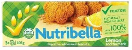 Citrommal és kurkumával ízesített, teljeskiőrlésű lisztből készült, vegánok által is fogyasztható, élelmi rostokkal dúsított, élesztő, tartósítószer, telítetlen zsírsav és adalékanyag mentes keksz. 105 g-os keksz fruktózzal; Nutribella termék az egészséges élelmiszerek kedvelőinek.