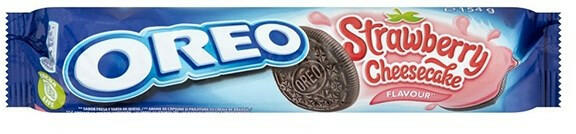 Keksz OREO epres sajttorta 154g Epres-sajttorta ízű töltelékkel (29%) töltött kakaós keksz.