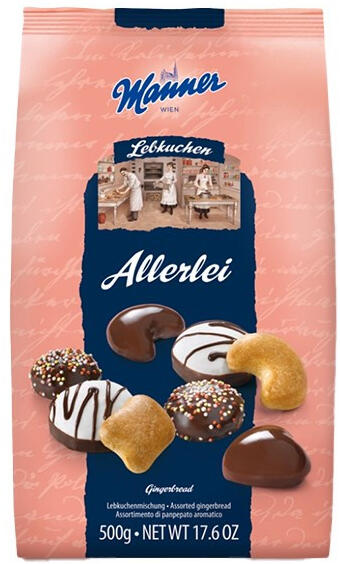 Mézeskalács válogatás MANNER 500 g mézes puszedli keverék a Manner összes mézeskalács specialitását magába foglalja, ami a legkifinomultabb ízlésű ínyencek kívánságainak is megfelel. Csokoládéval vagy finom cukormázzal bevont. A Manner „Allerlei mézes puszedli keverékében mindenki megtalálja a kedvére valót. Az 500 grammos csomagolás kiválóan alkalmas családi és