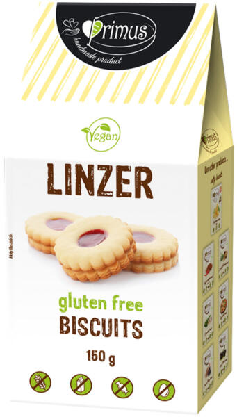Primus gluténmentes vegán linzer 150 g Linzer- csökkentett szénhidráttartalmú teasütemény, édesítőszerrel. Összetétel: gluténmentes zabpehely liszt, kajszibarack lekvár (kajszibarack 40%, maltitol, fruktóz, oligofruktóz, polidextróz, pektin, karragén, kálium-szorbát, citromsav, aroma) , eritrit, kölesliszt, kókuszzsír, tápióka keményítő, bambuszrost, napraforgó leciti