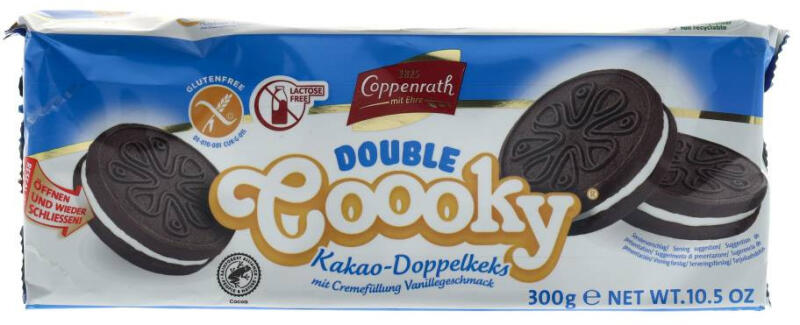 Gluténmentes és laktózmentes kakaós szendvicskeksz Bourbon vanília ízű töltelékkel, fenntartható gazdálkodásból származó pálmazsírral.
