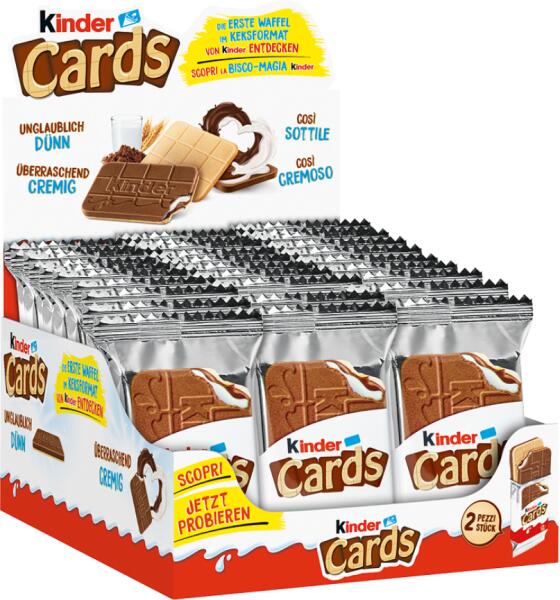 Kinder Cards ropogós ostya tejes és kakaós töltelékkel 25,6 g Hivatalos magyarországi forgalmazótól. Összetevők: Sovány tejpor (28%), Cukor, Pálmaolaj, Búzaliszt (15,5%), Zsírszegény kakaópor (4%), Emulgeálószer: lecitinek (szója), Étkezési só, Térfogatnövelő szer (nátrium-hidrogén-karbonát), Aroma (vanillin) Tápért kre vonatkozó adatok: Átlagos tápérték 100g ter