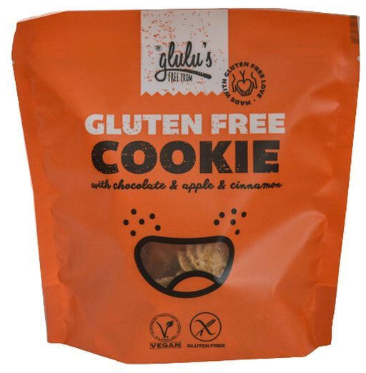 Glutén-, laktóz-, tej-, szója-, tojásmentes! Almás, fahéjas ízű, vegán édes keksz, csokoládé darabokkal. 100 g-os csokoládés almás-fahéjas keksz; Glulu termék az egészséges élelmiszerek kedvelőinek.