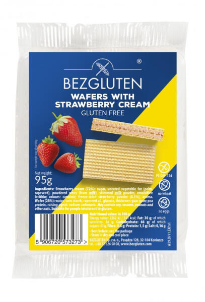 Bezgluten gluténmentes ostya epres 95 g Rövid szav. idő: 2024.05. 05. Összetevők : eperkrém (72%): cukor, keményítetlen növényi zsír (pálma, repce), tejsavópor (tejből ) , sovány tejpor , emulgeálószer: lecitin; festék: kármin; fagyasztva szárított eperpor (0,1%), aroma. Ostya (28%): víz, kukoricakeményítő, repceolaj, glükóz, sűrítőanyag: guargumi; borsófehérje, té