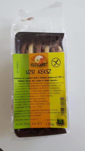 GLUTÉNMENTES NATURBIT UZSI KEKSZ 150Ggluténmentes lisztkeverék /kukorica és burgonyakeményítő, dextróz, kukoricaliszt, rizsliszt, porcukor, étkezési só, térfogatnövelő szer (Na-bikarbonát), aroma (vanillin) /, margarin /növényi zsír: pálmazsír, növényi olaj: napraforgóolaj, víz, részben hidrogénezett növényi zsír: pálmazsír, só, emulgeálószer: E 471, aromák, sav
