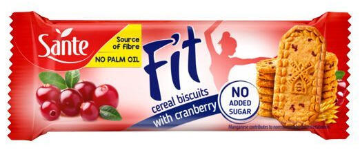 Sante fit áfonyás ízesítésű gabonaszelet zabbal, hozzáadott cukor nélkül, édesítőszerekkel, hozzáadott ásványi anyagokkal. 50 g-os fit keksz áfonyás hozzáadott cukor nélkül; Sante termék az egészséges élelmiszerek kedvelőinek.