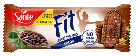 Sante fit kakaó ízesítésű gabonaszelet zabbal, hozzáadott cukor nélkül, édesítőszerekkel, hozzáadott ásványi anyagokkal. 50 g-os fit keksz kakaós hozzáadott cukor nélkül; Sante termék az egészséges élelmiszerek kedvelőinek.