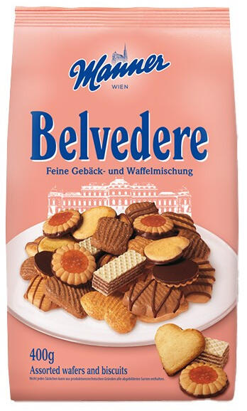 Keksz MANNER belvedere mix 400 g Vegyes ízesítésű, töltött kekszek, nápolyik egy csomagban. A közkedvelt vegyes keksz a Manner legjobb keksz- és ostyatermékeinek gyűjteménye: lekváros és csokoládés kekszek cukorszórással és anélkül, perecek és ostyaszeletek. 400 g-os tasakban. Tápérték adatok: 100 g termékben: Energiatartalom: 456kcal Zsír: 19g amelyből telített zsírs