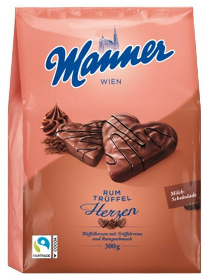 Töltött ostya MANNER szív rumos trüffeles 300g Töltött ostya MANNER szív rumos trüffeles Kiszerelés: 300g/csomag. Összetevők: Cukor; Növényi zsírok (kókusz, pálma); Búzaliszt ; Kakaóvaj; Kakaómassza; Sovány kakaópor; Édes tejsavópor ; Mogyoró ; Sovány tejpor ; Savókészítmény ; Vajzsír ; Teljes tejpor ; Laktóz ( tejcukor ); Emulgeálószer ( szójalecitin ); Aromák;